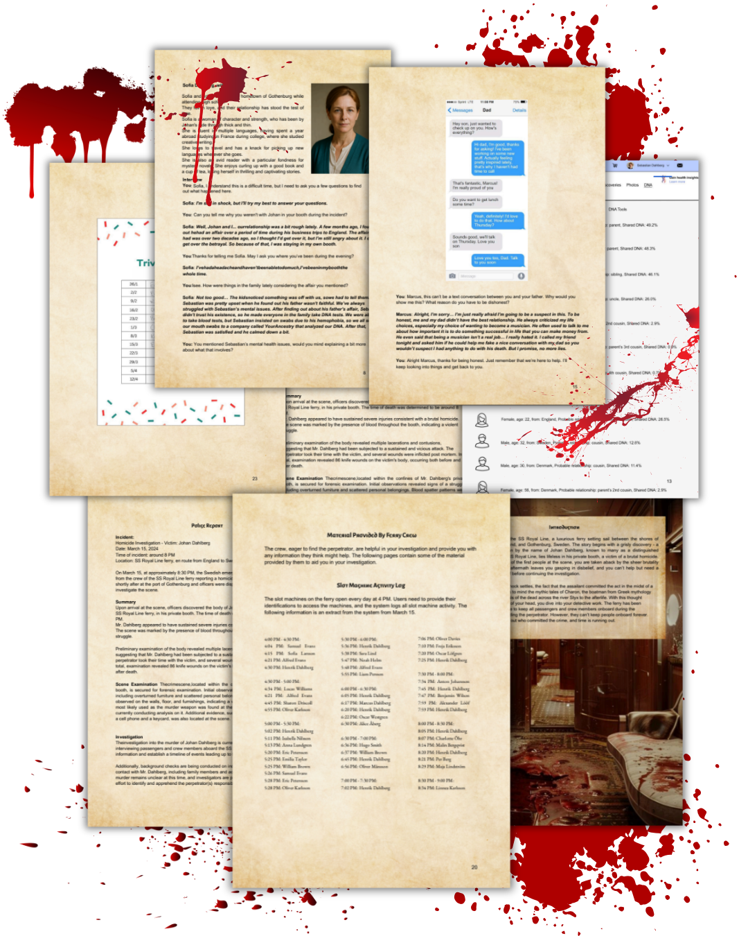 Welcome aboard the SS Royal Line, a luxury ferry sailing between England and Sweden. Passenger Johan Dahlberg has been brutally murdered, and the vessel is sealed. It’s up to you to find the killer before time runs out: can you unmask the murderer at sea?